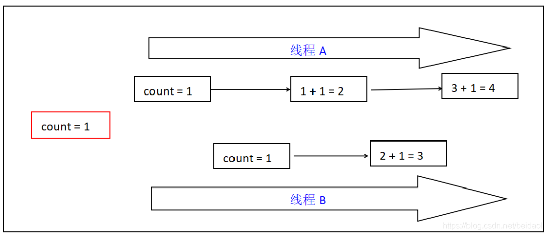 最常见的一种,就是我们A线程在进入方法后,拿到了count的值,刚把这个值读取出来,还没有改变count的值的时候,结果线程B也进来的,那么导致线程A和线程B拿到的count值是一样的。