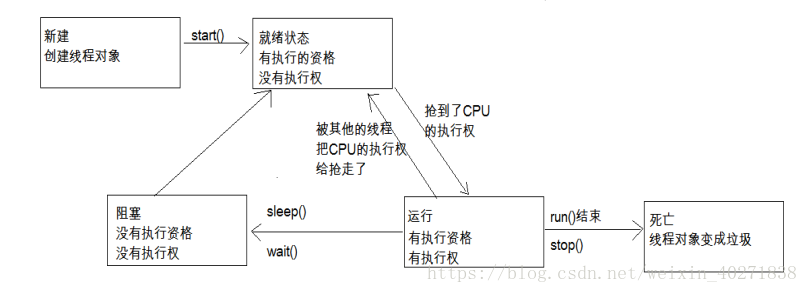 第一步,是用new Thread()的方法新建一个线程,在线程创建完成之后,线程就进入了就绪(Runnable)状态,此时创建出来的线程进入抢占CPU资源的状态,当线程抢到了CPU的执行权之后,线程就进入了运行状态(Running),当该线程的任务执行完成之后或者是非常态的调用的stop()方法之后,线程就进入了死亡状态。而我们在图解中可以看出,线程还具有一个则色的过程,这是怎么回事呢?当面对以下几种情况的时候,容易造成线程阻塞,第一种,当线程主动调用了sleep()方法时,线程会进入则阻塞状态,除此之外,当线程中主动调用了阻塞时的IO方法时,这个方法有一个返回参数,当参数返回之前,线程也会进入阻塞状态,还有一种情况,当线程进入正在等待某个通知时,会进入阻塞状态。那么,为什么会有阻塞状态出现呢?我们都知道,CPU的资源是十分宝贵的,所以,当线程正在进行某种不确定时长的任务时,Java就会收回CPU的执行权,从而合理应用CPU的资源。我们根据图可以看出,线程在阻塞过程结束之后,会重新进入就绪状态,重新抢夺CPU资源。这时候,我们可能会产生一个疑问,如何跳出阻塞过程呢?又以上几种可能造成线程阻塞的情况来看,都是存在一个时间限制的,当sleep()方法的睡眠时长过去后,线程就自动跳出了阻塞状态,第二种则是在返回了一个参数之后,在获取到了等待的通知时,就自动跳出了线程的阻塞过程