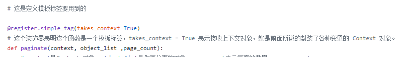 # 这个装饰器表明这个函数是一个模板标签,takes_context = True 表示接收上下文对象,就是前面所说的封装了各种变量的 Context 对象。