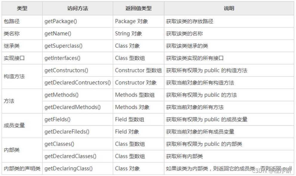 getConstructors()//获取公有getConstructor(Class<?>... parameterTypes)//获取指定公有getDeclaredConstructors()//获取所有getDeclaredConstructor(Class<?>... parameterTypes)//获取指定方法