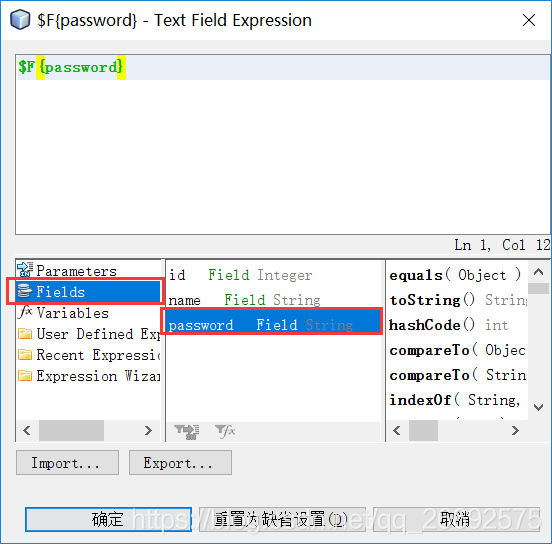 后面两个Text Filed跟上面相似,只是,后面两个分别对应数据库中的用户名和密码,所以我们选中Fields,分别选择name跟password,如下图