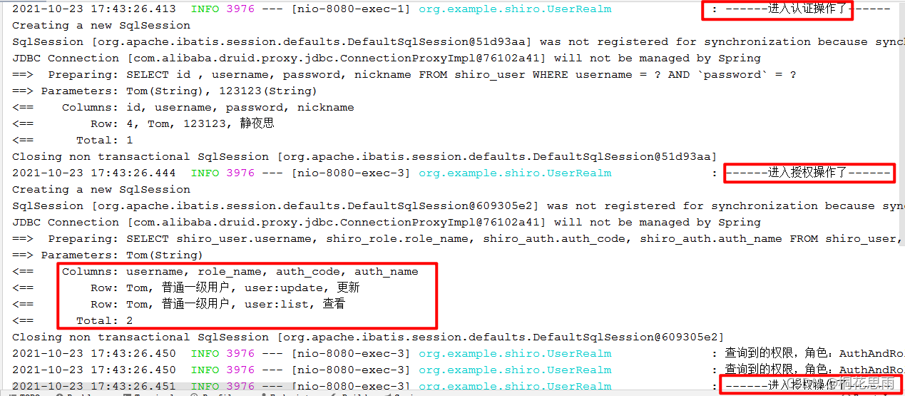 再看控制台日志,如下,注意账号 Tom 拥有的权限,在 index.html 页面有两个 <shiro:hasPermission> 标签,故而进行了两次授权操作