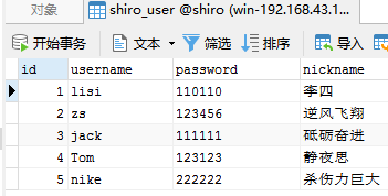 CREATE TABLE `shiro_user` ( `id` int(11) NOT NULL AUTO_INCREMENT, `username` varchar(255) NOT NULL, `password` varchar(255) NOT NULL, `nickname` varchar(255) NOT NULL, PRIMARY KEY (`id`), UNIQUE KEY `index_username` (`username`) USING BTREE ) ENGINE=InnoDB AUTO_INCREMENT=6 DEFAULT CHARSET=utf8mb4; INSERT INTO `shiro_user` VALUES (1, 'lisi', '110110', '李四'); INSERT INTO `shiro_user` VALUES (2, 'zs', '123456', '逆风飞翔'); INSERT INTO `shiro_user` VALUES (3, 'jack', '111111', '砥砺奋进'); INSERT INTO `shiro_user` VALUES (4, 'Tom', '123123', '静夜思'); INSERT INTO `shiro_user` VALUES (5, 'nike', '222222', '杀伤力巨大'); CREATE TABLE `shiro_user_role` ( `id` int(11) NOT NULL AUTO_INCREMENT, `user_id` int(11) NOT NULL, `role_id` int(11) NOT NULL, PRIMARY KEY (`id`) ) ENGINE=InnoDB AUTO_INCREMENT=5 DEFAULT CHARSET=utf8mb4; INSERT INTO `shiro_user_role` VALUES (1, 1, 1); INSERT INTO `shiro_user_role` VALUES (2, 2, 3); INSERT INTO `shiro_user_role` VALUES (3, 3, 3); INSERT INTO `shiro_user_role` VALUES (4, 4, 2); CREATE TABLE `shiro_role` ( `id` int(11) NOT NULL AUTO_INCREMENT, `role_code` varchar(255) NOT NULL, `role_name` varchar(255) NOT NULL, PRIMARY KEY (`id`) ) ENGINE=InnoDB AUTO_INCREMENT=5 DEFAULT CHARSET=utf8mb4; INSERT INTO `shiro_role` VALUES (1, '1', '管理员'); INSERT INTO `shiro_role` VALUES (2, '2', '普通一级用户'); INSERT INTO `shiro_role` VALUES (3, '3', '普通二级用户'); INSERT INTO `shiro_role` VALUES (4, '4', '普通三级用户'); CREATE TABLE `shiro_auth_role` ( `id` int(11) NOT NULL AUTO_INCREMENT, `auth_id` int(11) NOT NULL, `role_id` int(11) NOT NULL, PRIMARY KEY (`id`) ) ENGINE=InnoDB AUTO_INCREMENT=10 DEFAULT CHARSET=utf8mb4; INSERT INTO `shiro_auth_role` VALUES (1, 1, 1); INSERT INTO `shiro_auth_role` VALUES (2, 2, 1); INSERT INTO `shiro_auth_role` VALUES (3, 3, 1); INSERT INTO `shiro_auth_role` VALUES (4, 4, 1); INSERT INTO `shiro_auth_role` VALUES (5, 3, 2); INSERT INTO `shiro_auth_role` VALUES (6, 4, 2); INSERT INTO `shiro_auth_role` VALUES (7, 4, 3); INSERT INTO `shiro_auth_role` VALUES (8, 4, 4); INSERT INTO `shiro_auth_role` VALUES (9, 1, 3); CREATE TABLE `shiro_auth` ( `id` int(11) NOT NULL AUTO_INCREMENT, `auth_code` varchar(255) NOT NULL, `auth_name` varchar(255) NOT NULL, `parent_id` int(11) NOT NULL, PRIMARY KEY (`id`) ) ENGINE=InnoDB AUTO_INCREMENT=5 DEFAULT CHARSET=utf8mb4; INSERT INTO `shiro_auth` VALUES (1, 'user:add', '添加', 1); INSERT INTO `shiro_auth` VALUES (2, 'user:delete', '删除', 2); INSERT INTO `shiro_auth` VALUES (3, 'user:update', '更新', 3); INSERT INTO `shiro_auth` VALUES (4, 'user:list', '查看', 4);
