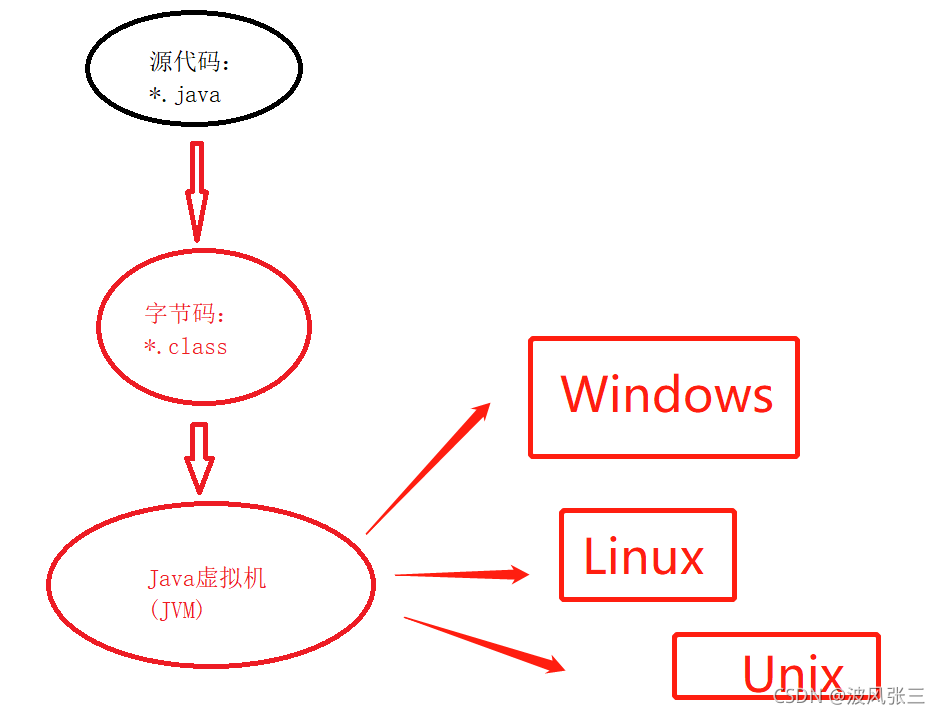 所有的Java源代码(以.java为扩展名),通过Java编译器javac变成字节码,也就是以.class为扩展名的文件。然后利用命令Java讲对应的字节码通过java虚拟机(JVM)解释为特定操作系统,如Windows,Linux等能理解的机器码,最终Java程序得以运行。