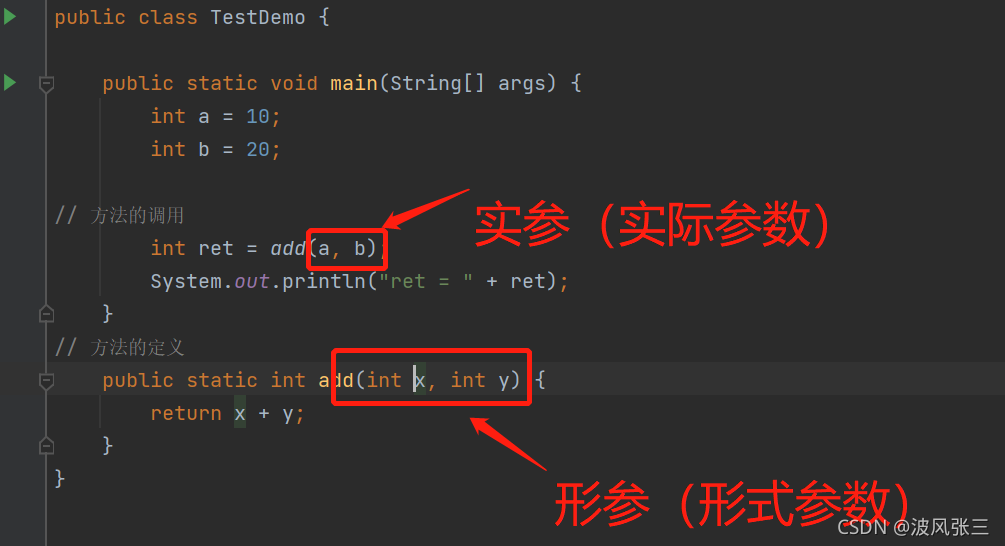 - 形参变量隶属于方法体,也就是说它们是方法的局部变量,只有在被调用的时候才被创建,才被临时性分配内存,在调用结束后,立即释放所分配的内存单元。也就是说,当方法调用返回后,就不能再使用这些参数了。