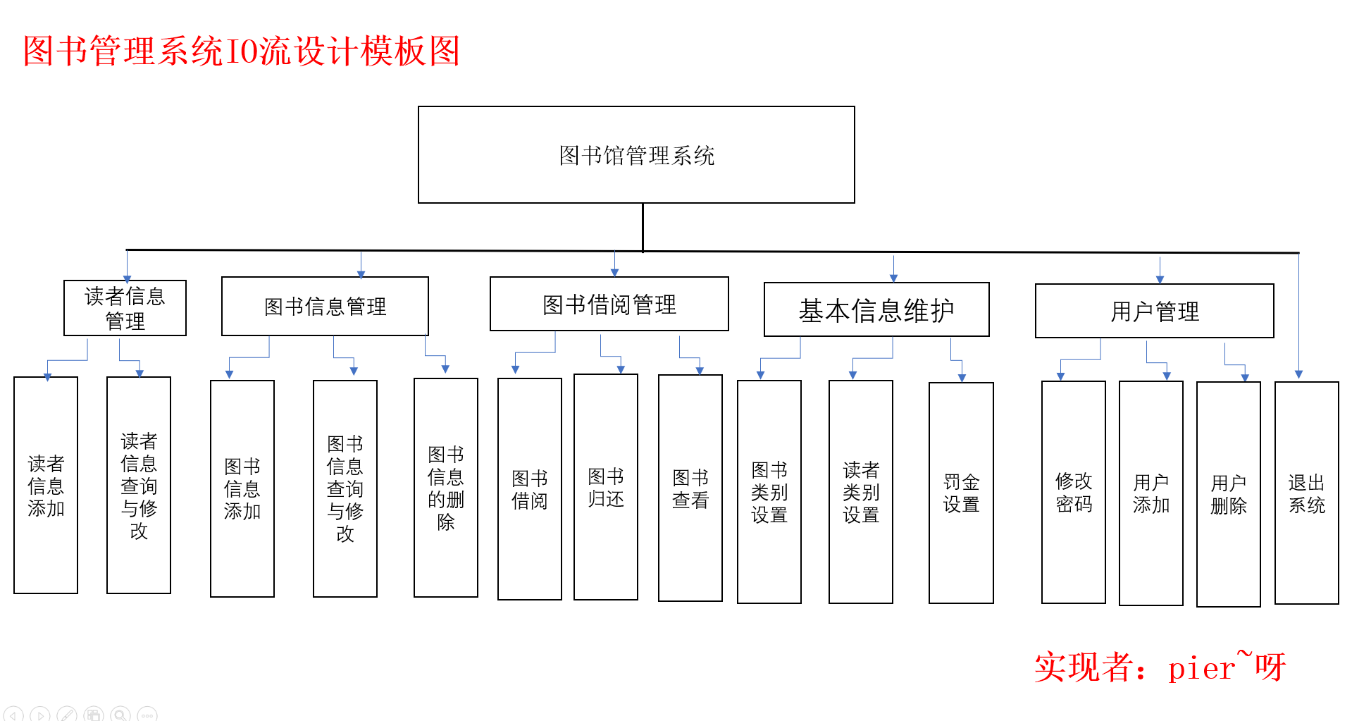- 基础信息维护:包括图书类别设置、读者类别设置及罚金设置。图书类别设置,可以对图书的类别进行增加、删除、修改和查询;读者类别设置可以对读者的类别进行增加、删除、修改和查询;罚金设置,可以指定超期一天的罚金标准。