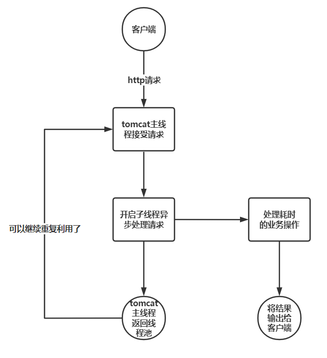 tomcat 线程,将请求转发给我们自定义的子线程去处理这个请求,然后 tomcat 就可以继续去接受新的请求了。