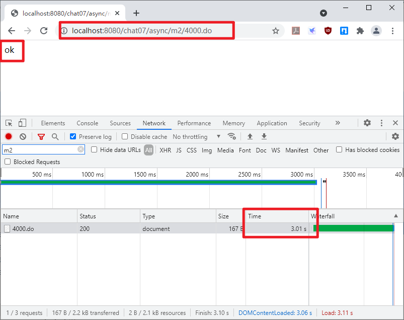 上面的 m2 方法个 timeout 参数,调用者通过这个参数来指定接口的超时时间,未超时的情况下,也就是说 timeout 大于 3 秒的时候,此时会输出 ok,否则将出现超时,此时会将 DeferredResult 构造器第 2 个参数的执行结果作为最终的响应结果,即会向客户端输出 timeout。