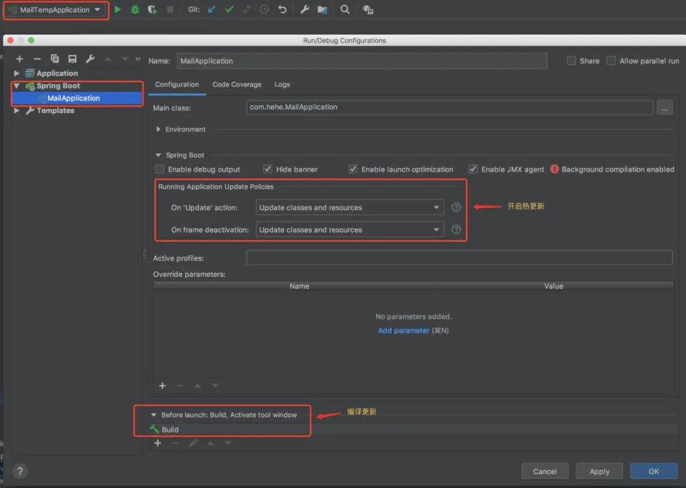 具体步骤:顶部菜单- >Edit Configurations->SpringBoot插件->目标项目->勾选热更新。