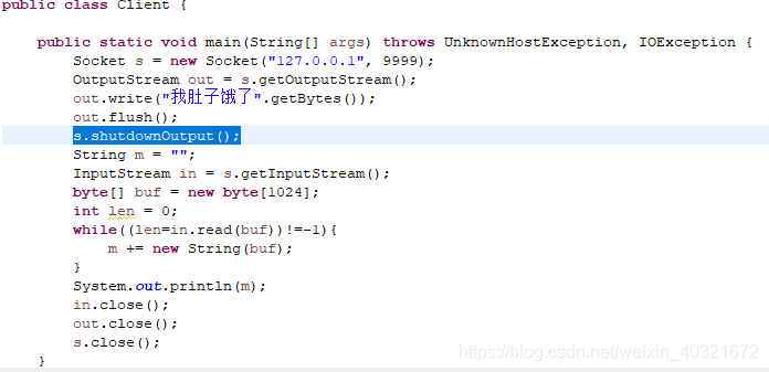 文件它是自己知道读到文件末尾了,那么我们的Socket是两端的通信,一直等待着对方传来数据的,并不知道啥时候会完,所以就会一直不会等于-1,阻塞在while循环里了,下面的代码就不会被执行。