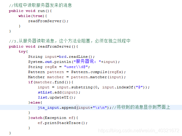 对于服务器端而言,给每个客户端启动一个线程,然后在每个客户端各自的线程里循环去读客户端发来的数据,没的话阻塞等待直到有,有的话转发,所以阻塞在循环里也无所谓,反正while循环之外我暂时也没想着执行。当然,还是要把它结束掉。