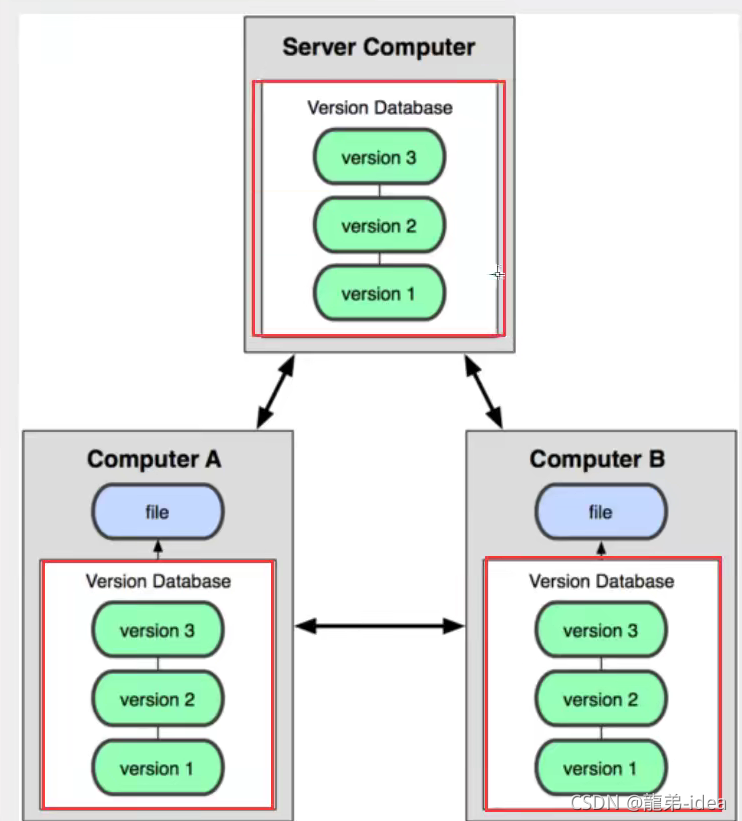 所有版本信息仓库全部同步到本地的每个用户,这样就可以在本地查看所有版本历史,可以离线在本地提交,只需在连网时push到相应的服务器或其他用户那里。由于每个用户那里保存的都是所有的版本数据,只要有一个用户的设备没有问题就可以恢复所有的数据,但这增加了本地存储空间的占用。