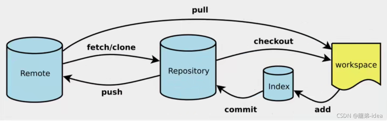 - Remote:远程仓库,托管代码的服务器,可以简单的认为是你项目组中的一台电脑用于远程数据交换