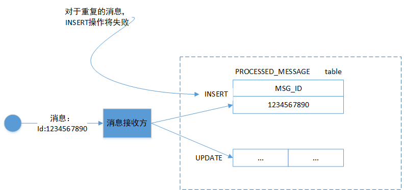 另一个解决方案是消息处理程序在应用程序表,而不是专门表中记录 message id。当时用具有受限事务模型的NoSQL数据库时,此方法特别有用,因为 NoSQL数据库通常不支持将针对两个表的更新作为数据库事务。
