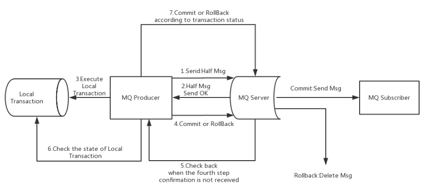 1、生产者发送一个半消息给MQServer(半消息是指消费者暂时不能消费的消息)