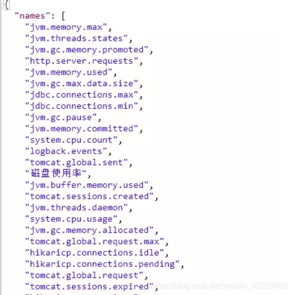 这些数据都是可以监控到的,“磁盘使用率”,这个是我自定义的metrics端点信息,在下面的文章中我会教大家怎么自定义你想要的端点,如果你想看更具体的请在路径后面加上你要看的数据,/{name},如: