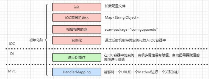 初始化阶段中又可以分为IOC、DI和MVC阶段:
