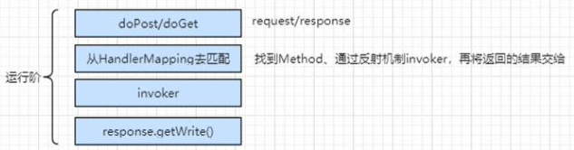 运行阶段中,当接受到一个url后,会到HandleMapping集合中,找到对应Method、通过反射机制去执行invoker,再返回结果给调用方。