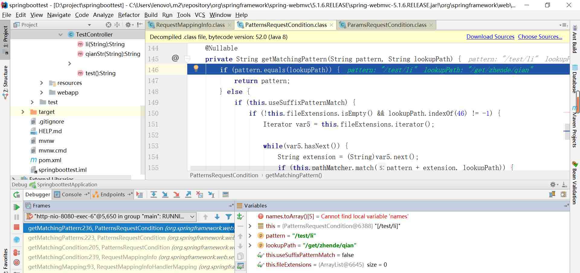 URL @PathVariable 变量的匹配是由PatternsRequestCondition 来完成的,具体的是由 AntPathMatcher 来处理,项目启动后会将提供的url 放入容器handlerMappings 中,当请求过来时会将请求path 和handlerMappings 中的pattern 逐一匹配,由匹配时会将路径先分词,有{str}变量的转成 (.*) 再匹配,匹配完成后调用相应的handlermethod执行方法,进入目标方法。