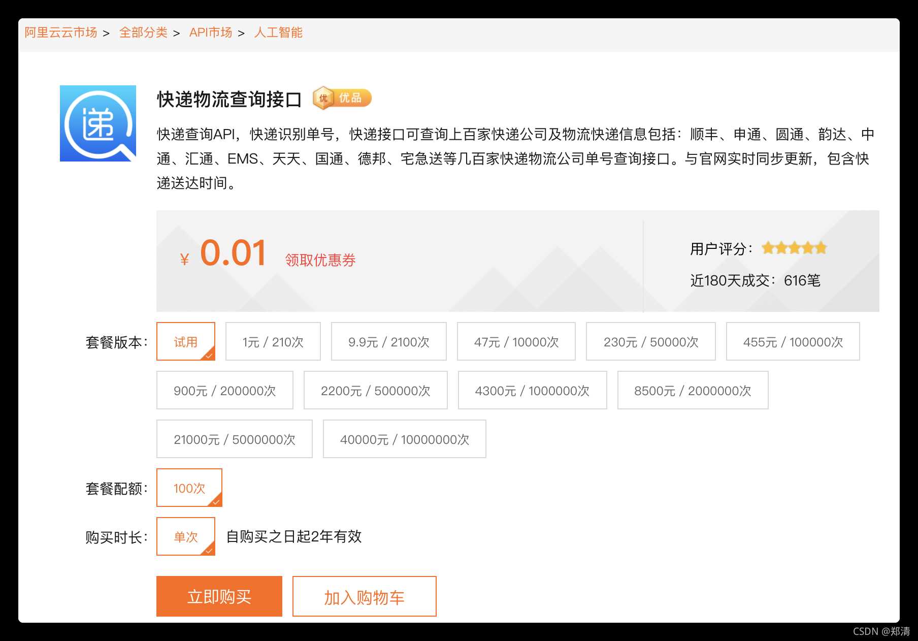 注:需要购买快递物流查询接口服务获取AppCode