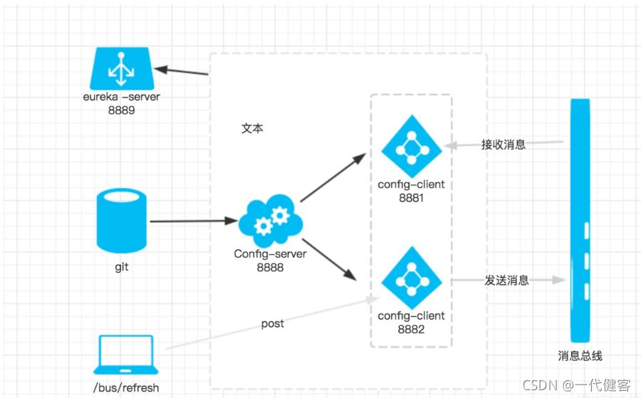当git文件更改的时候,通过pc端用post 向端口为8882的config-client发送请求/bus/refresh/;此时8882端口会发送一个消息,由消息总线向其他服务传递,从而使整个微服务集群都达到更新配置文件。