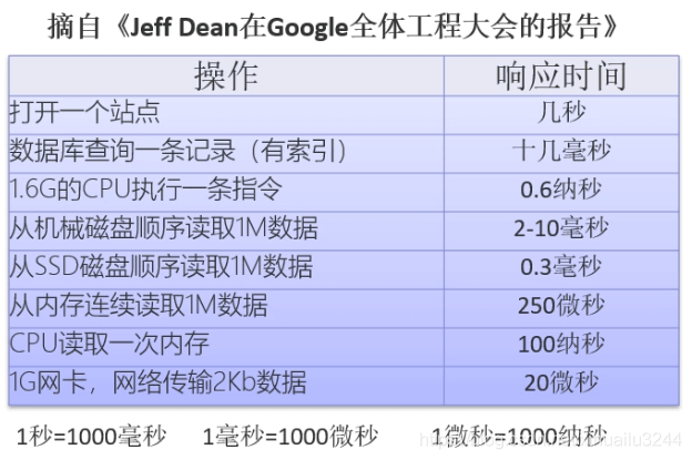 计算机在做一些我们平时的基本操作时,需要的响应时间是不一样的!如果我们计算一次a+b所需要的的时间: