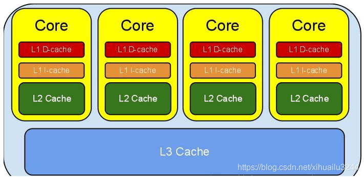 在现代CPU上,一般来说L0, L1,L2,L3都集成在CPU内部,而L1还分为一级数据缓存(Data Cache,D-Cache,L1d)和一级指令缓存(Instruction Cache,I-Cache,L1i),分别用于存放数据和执行数据的指令解码。每个核心拥有独立的运算处理单元、控制器、寄存器、L1、L2缓存,然后一个CPU的多个核心共享最后一层CPU缓存L3。