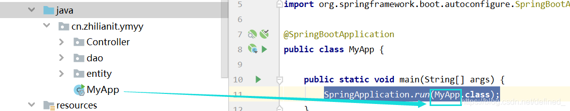 SpringApplication.run(MyApp.class);//MyApp为你的启动类的名称 如下图