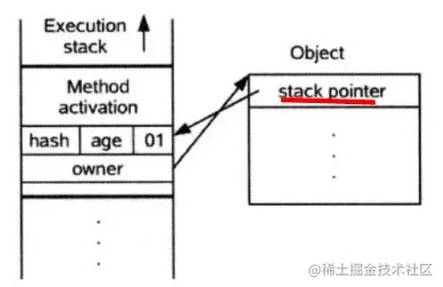 如果成功,当前线程持有该对象锁,将对象头的 Mark Word 锁标志位设置为“00”,表示对象处于轻量级锁定状态,执行同步代码块。这时候线程堆栈与对象头的状态如下图所示: