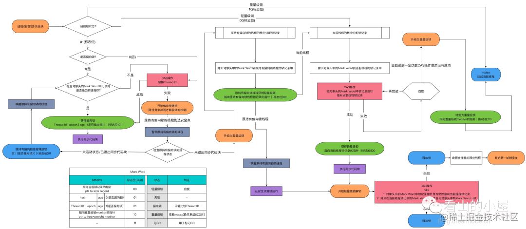 - synchronized 复用了对象头的 Mark Word 状态位,实现不同等级的锁实现。