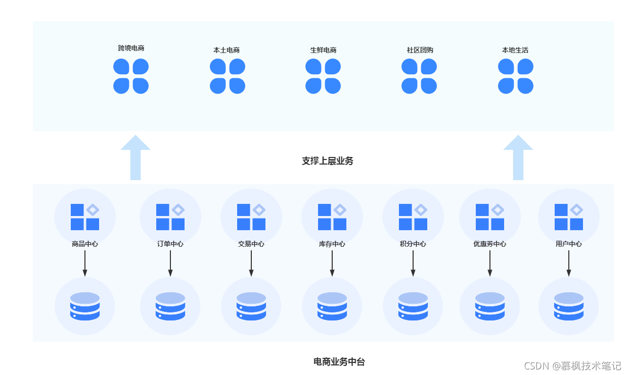 随着业务的发展,微服务架构逐渐成为当下业务中台的主流架构形式,它不但解决了各个应用之间的解耦问题,同时也解决了单体应用的性能问题实现可扩展可动态伸缩的能力。如下图所示,业务中台就是将平台的通用能力进行下沉,避免重复建设,形成底座平台能力,上层的各个应用服务都是基于中台能力进行快速构建。但是随着应用规模的扩大,原本在单体应用中不是问题的问题,在微服务架构中可能就是比较严重的问题,本文所要探讨的服务之间的数据一致性便是其中最具代表性的问题。本文将结合常见的电商下单场景来说明业务中台数据一致性方案。