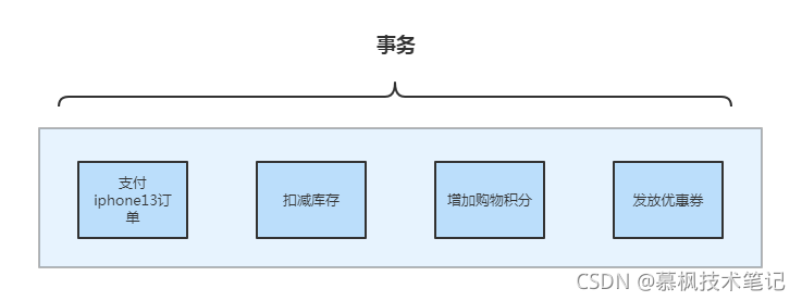 都说王守义 13 香,笔者最近也下单了一部 pro 准备换掉三年前的 iphone。那么我们以下单购买 iphone13 进行举例说明,我们暂时将如下图所示,如果在一个完整事务中,存在生成订单、扣减库存、增加积分以及发放优惠券这四项业务,那么要么这四项都成功,下单够购买 13 香这个业务才算是成功,中间有一项失败就会造成业务数据的不一致,因此需要进行事务回滚,回滚到下单前的状态,以保证业务数据的一致性。