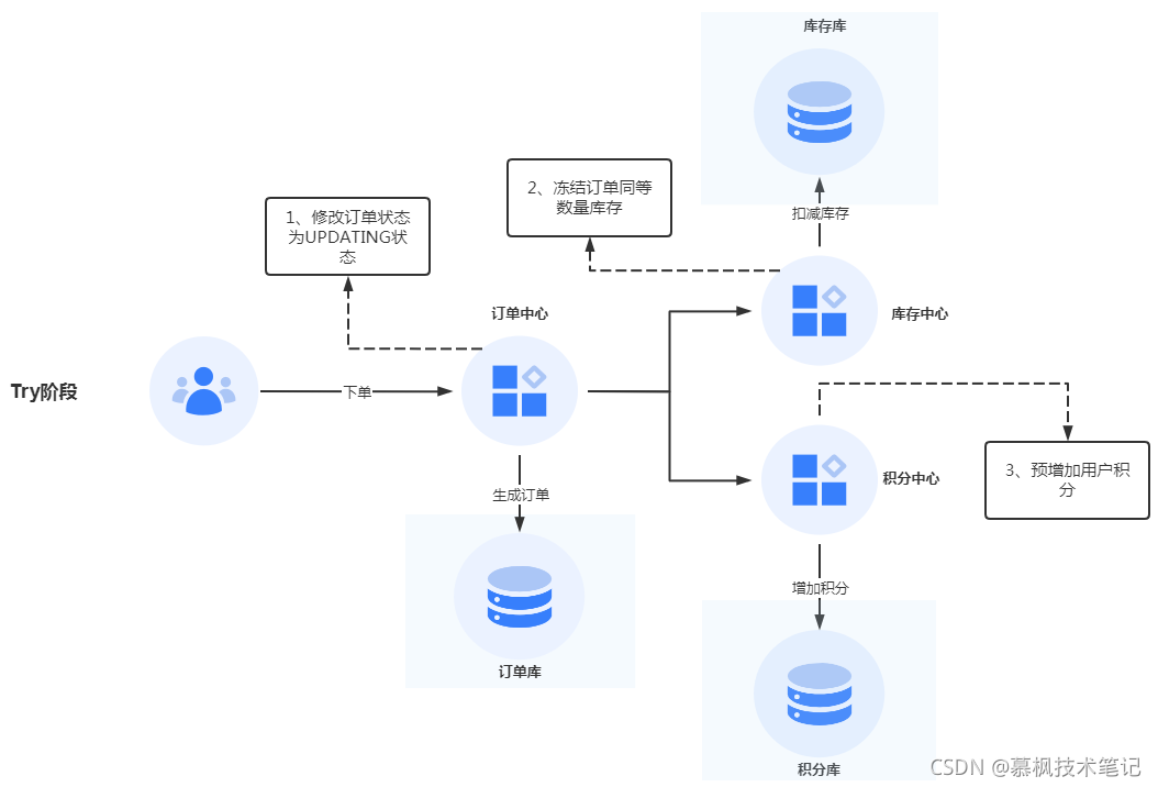 这个阶段主要实现尝试执行对应的业务,可以理解为一种预备执行的状态。因为在完成业务流程之前,并不知道各个业务节点或者可以理解为子事务是否可以正常执行,因此尝试在各个子事务去预先执行,看看能不能正常处理。