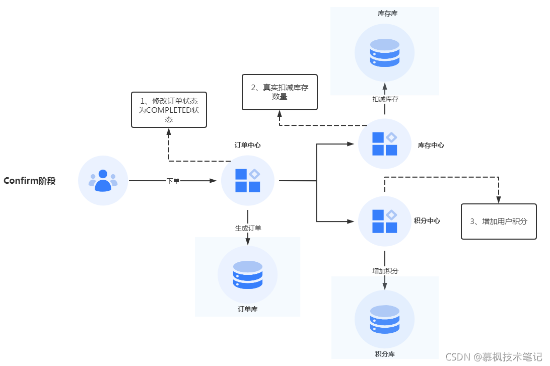 如果有幸进入这个阶段,说明前期的 try 阶段都已经处理成功了,即为订单的状态成功变更为 UPDATING 状态,库存中的订单数据量已经被锁定,用户对应的购物积分已经预先增加了,这三个步骤都已经完美实现了。对应的 TCC 框架已经感知到各个 Try 阶段的执行结果,因此在执行 Confirm 时候需要执行对应服务提供的 Confirm 接口去完成实际的数据提交。