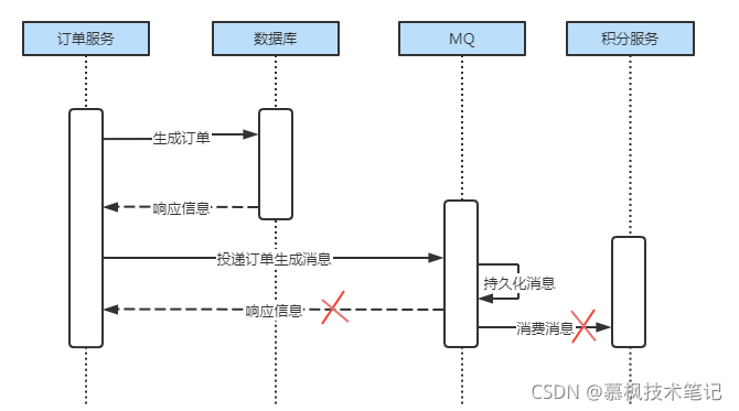 由于引入了消息中间件,服务之间的调用不再是依次的同步调用,各自服务通过消费对应的订单消息来实现各自的业务。当用户进行下单操作后,订单服务会生成对应的订单信息,而后发送订单生成消息。但是由于是分布式系统,受网络等因素的影响,有可能出现消息发送完成后订单服务未接收到消息中间件返回的响应信息,因此订单服务将之前的订单数据进行了回滚,但是积分服务已经将 MQ 中的订单信息进行了消费,增加了用户积分。这就造成了订单与积分数据不一致的情况。 另外如果在订单生成之后,订单服务挂掉了无法正常投递消息也会造成数据不一致的情况。