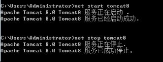 在命令控制台cmd中启动,在cmd中输入如下语句可以打开或关闭Tomcat服务器: