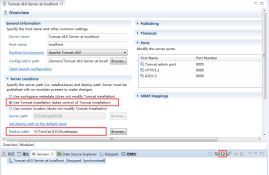 完成Tomcat服务器的创建之后,还需要对Tomcat服务器进行配置,双击【Servers】标签下创建的服务器,就会弹出服务器的【Overview】窗口,找到【ServerLocations】配置选项,选择【UseTomcatinstallation】选项,这样下面的【Serverpath】会自动设置为Tomcat服务器的安装目录,之后再手动把【Deploypath】设置成webapps,这样就完成了在Eclipse中的Tomcat服务器所有的配置: