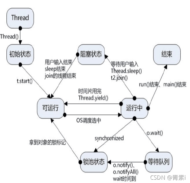 (3)其他阻塞:通过调用线程的sleep()或发出了I/O请求时,线程会进入到阻塞状态。当sleep()状态超时、join()等待线程终止或是超时。或是I/O处理完毕时,线程重新转入就绪状态。