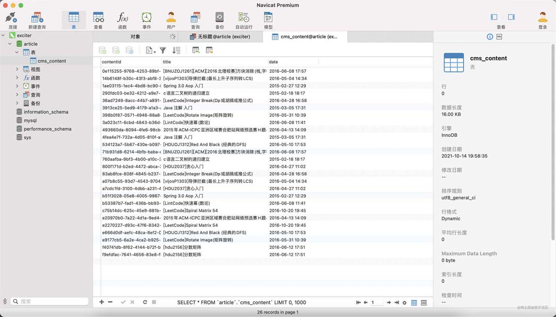 本示例中库名为article,表名为cms_content,表中包含contentId、title、date三个字段。