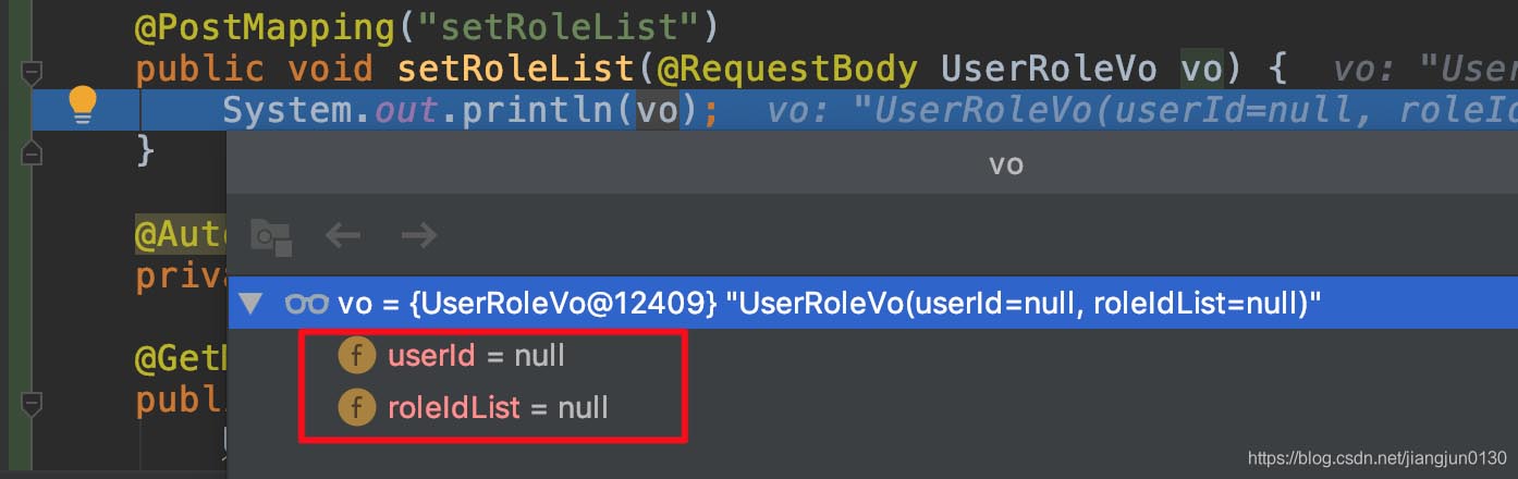 在接口请求过程中,传递json对象,springboot转换为实体VO对象后,所有属性都为null。