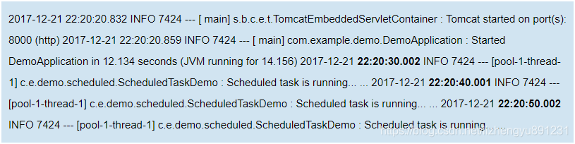 上面的代码提供了一个线程池大小为2的taskScheduler, 现在再启动下SpringBoot看看效果.