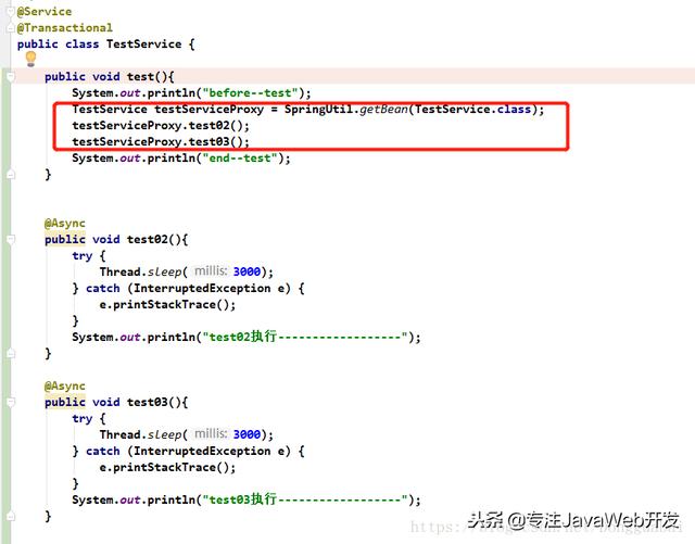 失效的原因是因为我们是在test()方法中直接调用的test02()和test03()方法,相当于是this.test02()和this.test03()调用的,也就是说真正调用test02()和test03()方法的是TestService对象本身调用的,而@Async和@Transactional注解本质使用的是动态代理,真正应该是TestService的代理对象调用test02()和test03()方法。其实Spring容器在初始化的时候Spring容器会将含有AOP注解的类对象“替换”为代理对象(简单这么理解),那么注解失效的原因就很明显了,就是因为调用方法的是对象本身而不是代理对象,因为没有经过Spring容器,那么解决方法也会沿着这个思路来解决。