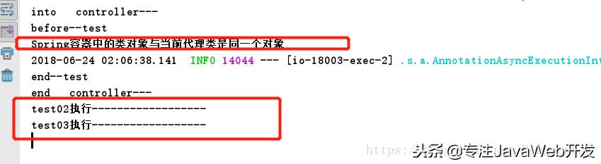 方法执行结果明显与我们的预期不符,方法的输出顺序表示了test02()和test03()两个异步方法居然同步执行了,也就是说@Aysnc注解失效了!