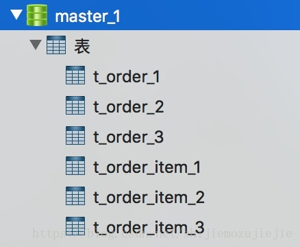 第三幅图截的是第二个主库,里面对订单和订单明细表做了分表操作,具体的分片策略和分片算法下面再做介绍。第三个主表和第二个主表是一样的,所有的从表都和对应的主表是一致的。