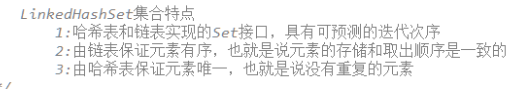 特点:集合是无序的(存储与取出顺序不一致),且不允许有重复元素,没有索引值,因此不能使用普通for遍历。
