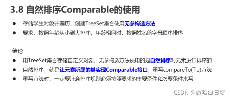 String类实现类自然排序Comparable接口,则可以直接调用用来判断字符串之间的大小,而当一个类的对象之间需要比较时,是需要实现自然排序Comparable接口,重写其中compareTo的方法。(TreetSet可以通过匿名内部类的方法来进行重写自然排序方法)。