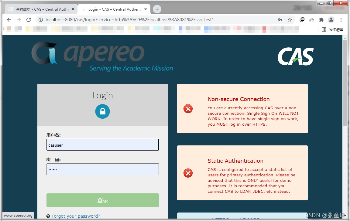 #使用http协议 cas.tgc.secure=false cas.serviceRegistry.initFromJson=true #由于https协议默认使用的端口为8443,还需我们修改为tomcat的8080端口 server.port=8080