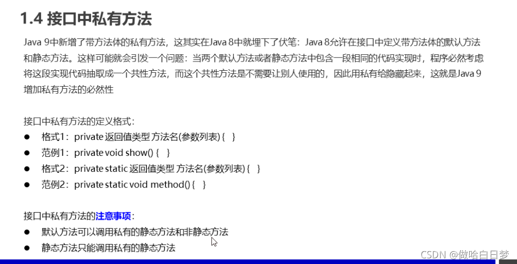 私有方法:私有方法主要是在接口里面进行使用,有private关键字进行修饰,通过将相同的代码段写在私有方法里面,提高了代码的复用性和简便性,静态的私有方法只能用静态来进行修饰,非静态的可以有非静态和静态方法都能修饰。