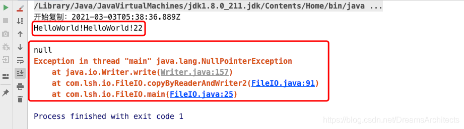 是代码中每次调用readline()方法,就会向下读取一行所以错误代码中表示的是while 判断 的第一行不为null,打印的是第二行 ,然后写入的是第三行,在次while判断的是第四行 有内容,打印的是第五行 为null,写入的是第六行也为null,就导致了空指针异常。