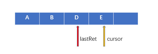 下面我们一步一步来分析 Itr 的操作。如图一所示,开始时 cursor 指向下标为 0 的元素,lastRet 指向下标为 -1 的元素,也就是 null。每调用一次 next,cursor 和lastRet 就分别会自增 1。当 next 返回 “C” 时,cursor 和 lastRet 分别为 3 和 2 [图二]。